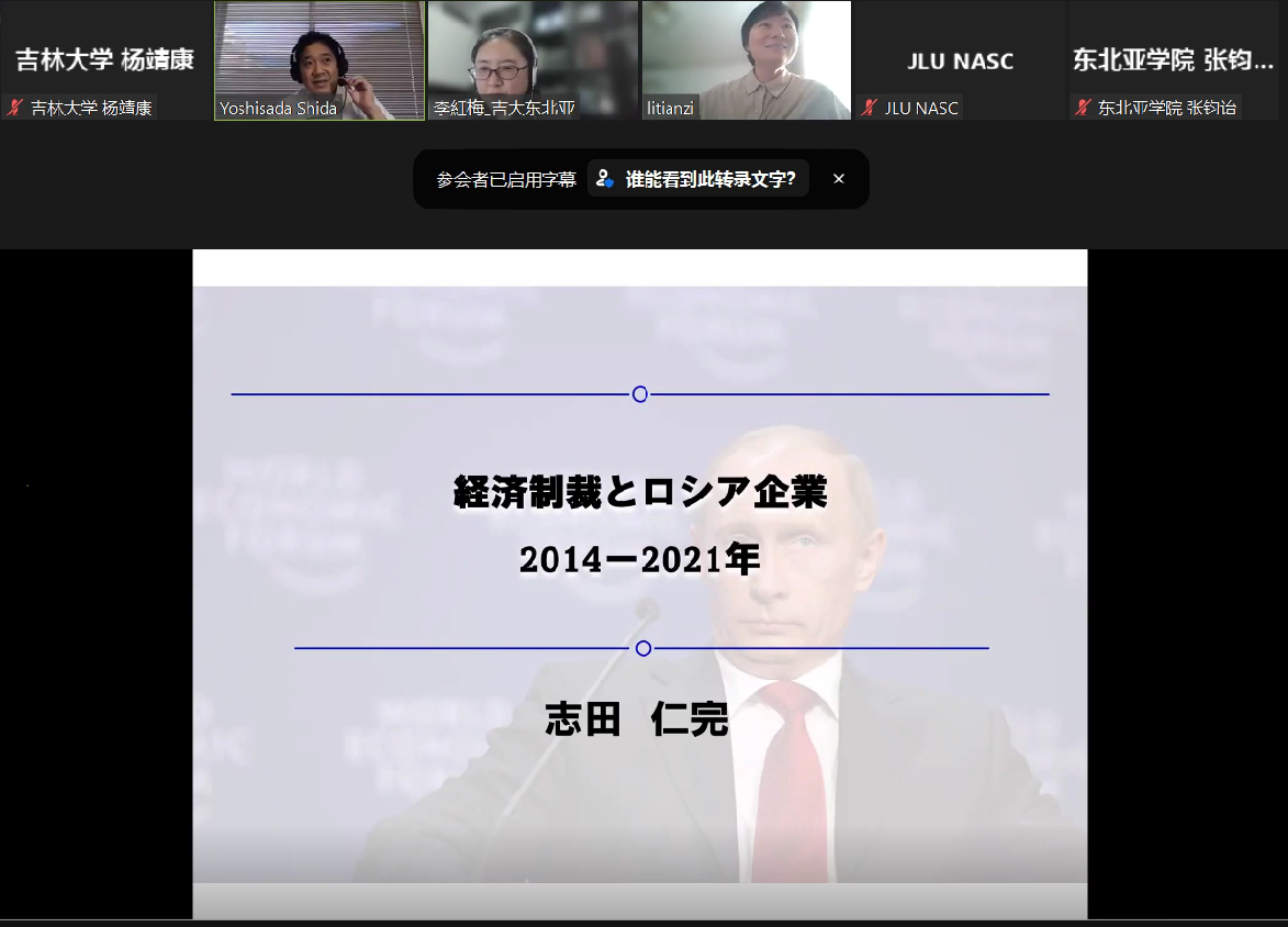 On November 26th, 2022, a high-end lecture on "The Russian Economy under Economic Sanctions" of the High-End Symposium on Northeast Asia International and Regional Studies was successfully held online. The lecture was jointly organized by the Northeast Asian Research Center of Jilin University, the Northeast Asian Studies College of Jilin University, and the Special Committee for Northeast Asian Regional Studies, Academic Association for International Cultural Exchange. The Northeast Asian Studies College of Jilin University invited SHIDA YOSHISADA, Associate Professor of the Department of International Economics, School of Economics, Seinan Gakuin University, Japan, to give this lecture. The lecture was hosted by Professor Li Tianzi of the Northeast Asian Research Center of Jilin University and translated by Associate Professor Li Hongmei of the Northeast Asian Studies College of Jilin University. Faculty members and students of the Northeast Asian Studies College attended the lecture online. At the beginning of the lecture, Prof. Li Tianzi extended a warm welcome to Prof. SHIDA YOSHISADA on behalf of Prof. Wu Hao, Dean of the Northeast Asian Studies College of Jilin University.