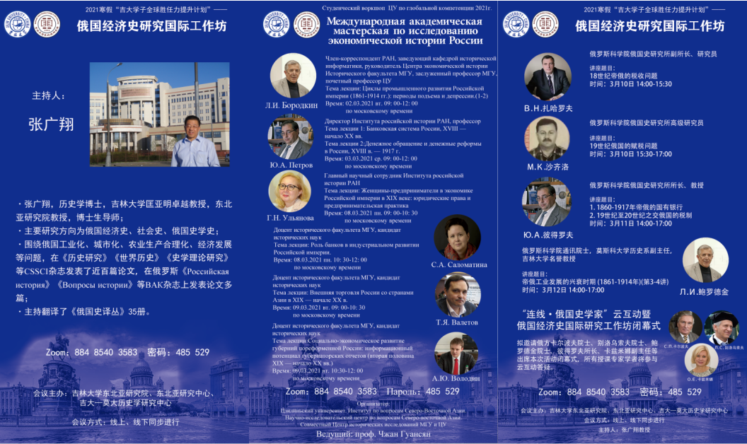 From March 2nd to 15th, 2021, the 2021 Jilin University Global Competency Enhancement Program: International Workshop on Russian Economic History Research was successfully held in Jilin University. The event was co-sponsored by the Northeast Asian Studies College of Jilin University, the Northeast Asian Research Center of Jilin University, and the Jilin University-Moscow State University History Research Center, and guided by the Office of Global Engagement of Jilin University, and was carried out online and offline at the same time. More than 10 top scholars in the field of Russian historiography, including experts and scholars from many fraternal universities and scientific research institutions in China, as well as academicians С.П. Karpov, Academician Л.С. Belousov, Academician Л.И. Borodkin, Professor Ю.А. Petrov and other top scholars from Moscow State University and the Russian Academy of Sciences, gathered on line to build quality universities together, bringing a wonderful historical feast to the students of Jilin University , and at the same time deeply discussed and looked forward to the results and development prospects of cooperation between China and Russia in the field of Russian history. The two-week series of international workshops culminated on March 15th .