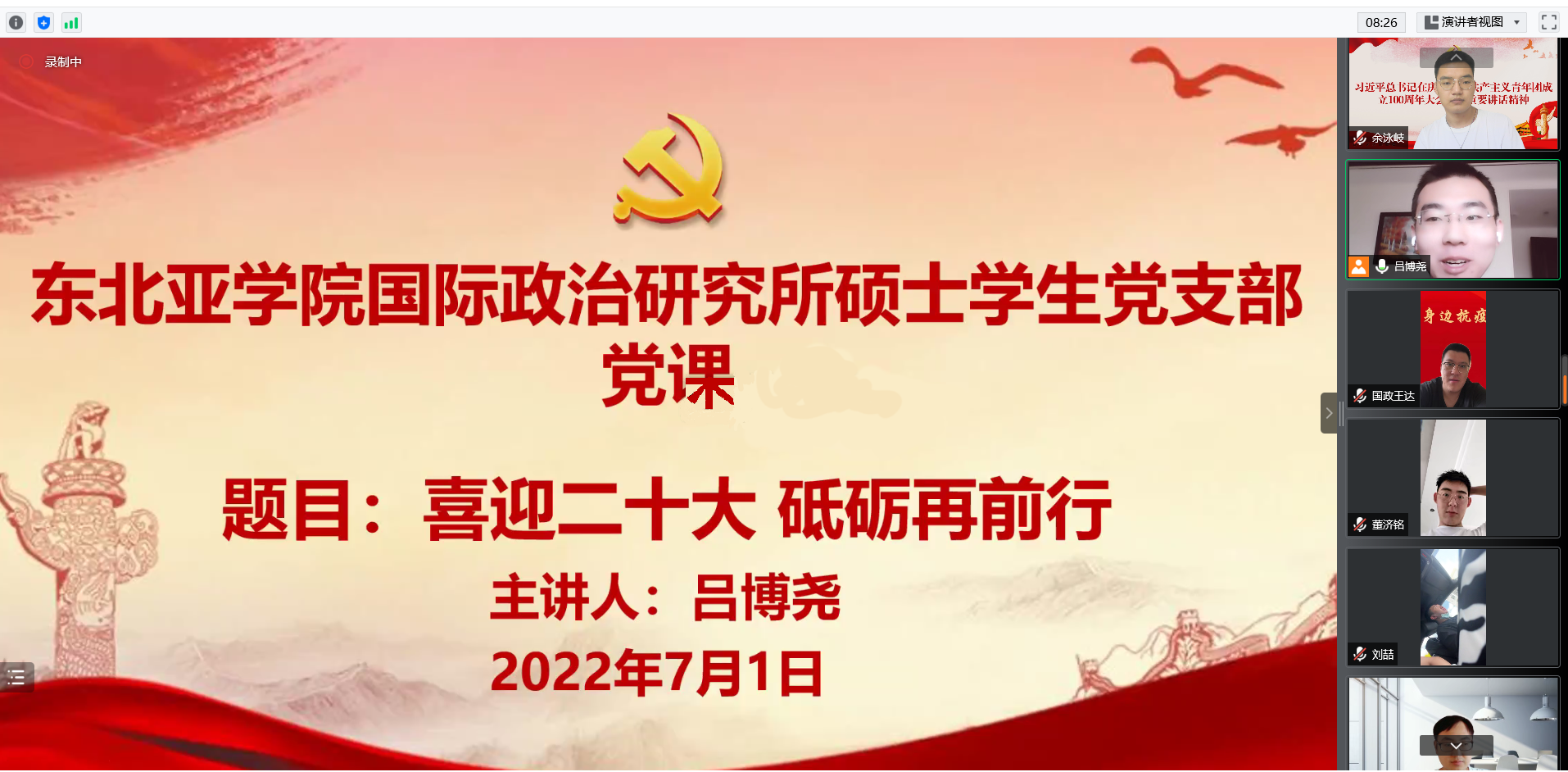 硕士学生第一党支部书记卞雨晨以“回顾光辉史,喜迎二十大,启航新征程”为题讲党课,国际政治研究所硕士学生党支部书记吕博尧以“喜迎二十大,砥砺再前行”为题讲党课,与支部党员一起回顾了中国共产党的光辉历史。支部全体党员一致表示,青年兴则国家兴,青年强则国家强,我们要立大志、勇担当、勤奋斗、长才干,不负时代使命,用理想之光照亮奋斗之路,用信仰之力开创美好未来。
