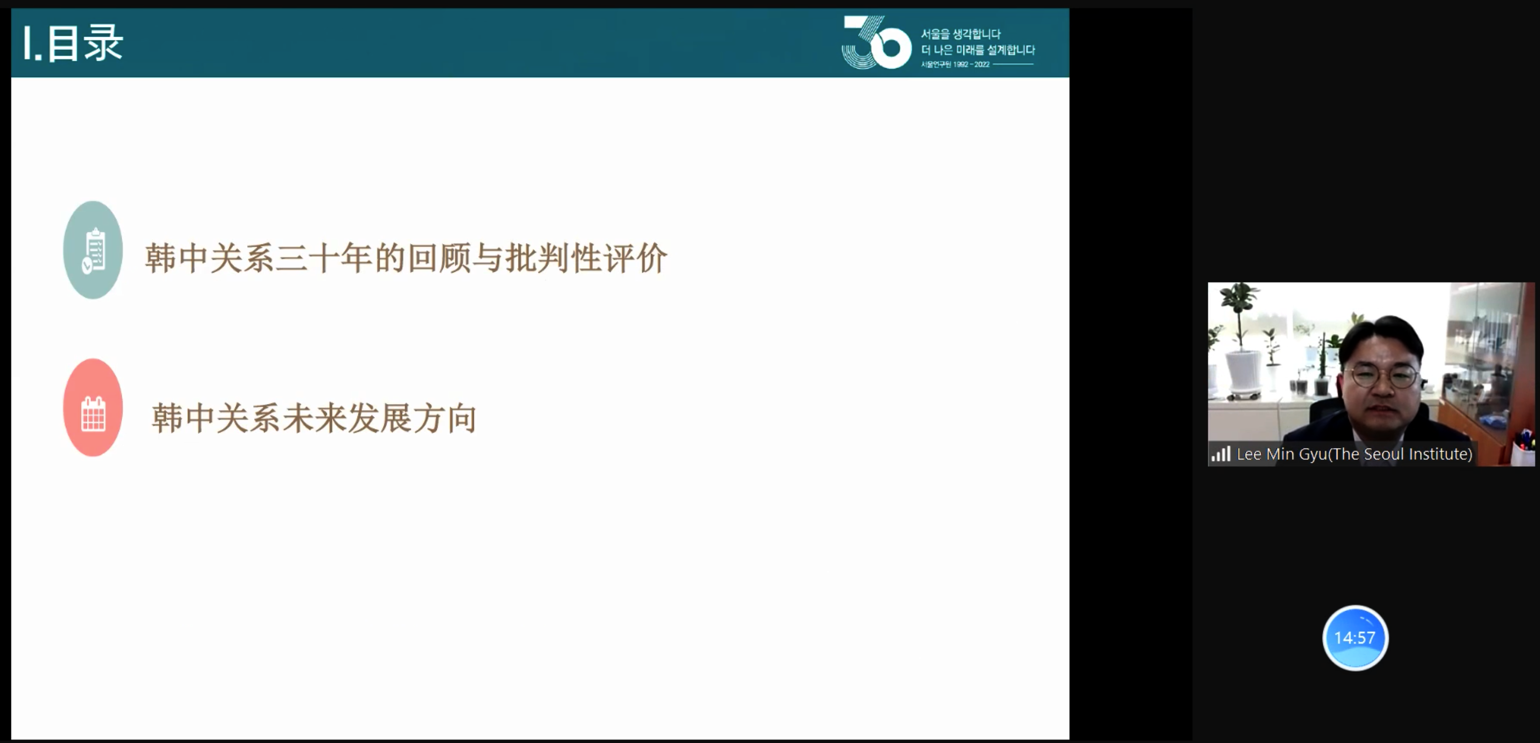 2022年11月2日,“东北亚国别与区域研究高端讲坛”之“中韩建交三十年的批判性评价与发展方向”在黄色直播 顺利举行。本次讲座由黄色直播 东北亚研究中心、黄色直播 、东北亚研究院、黄色直播 朝鲜韩国研究所、国际文化交流学术联盟东北亚区域研究专门委员会联合举办。黄色直播 邀请到了韩国首尔研究院研究员李敃窥(Lee Min Gyu)教授,李敃窥教授贡献了一场精彩绝伦的讲座。讲座由黄色直播 教授玄春姬主持。讲座伊始,玄春姬教授代表黄色直播 院长吴昊教授向李敃窥教授表示了热烈的欢迎和崇高的谢意。