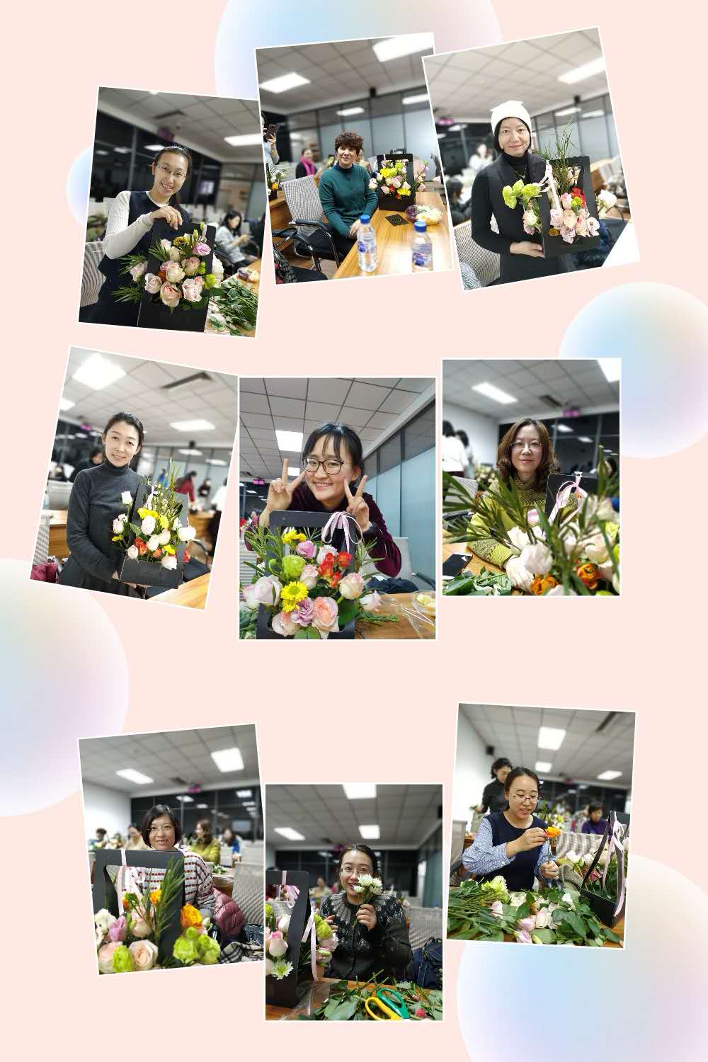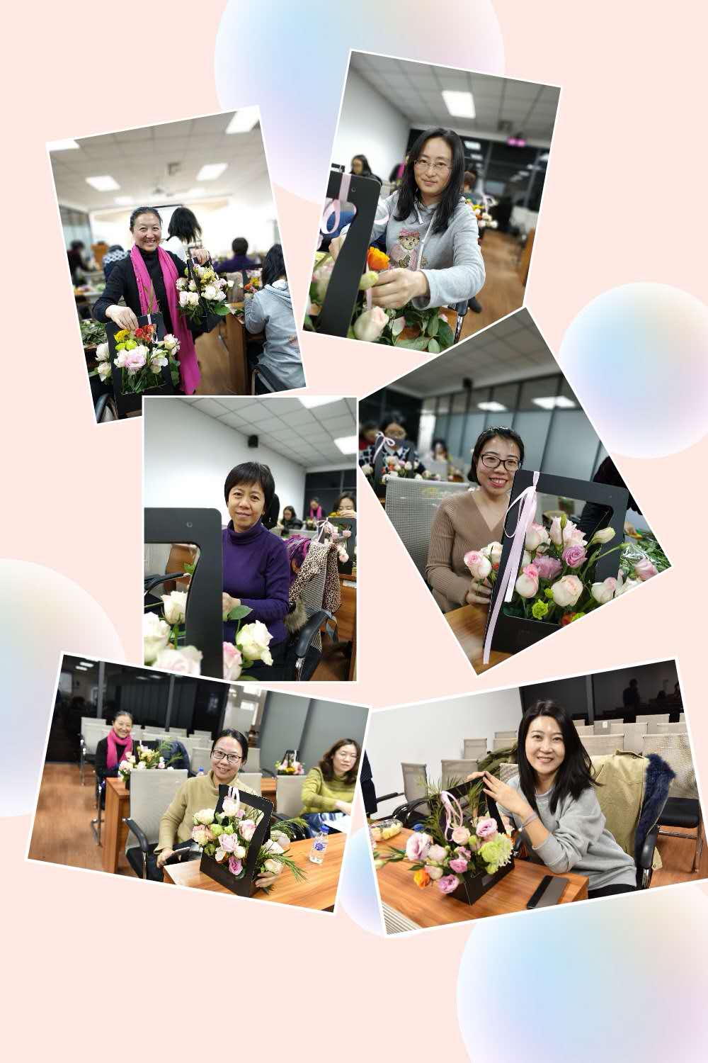 现场实物操作培训中,妇委会为每位参加培训的老师精心备好了一份插花材料:精美的花篮、一把剪刀、多种漂亮的鲜花。花艺老师为大家简单介绍了花束的特点及注意事项之后,便开始一边讲解一边示范,现场辅导大家动手插花。大部分老师都是第一次插花,虽然手法生疏,但是兴致盎然。经过一个小时左右的努力,一盆盆融合了大家丰富想象力的插花作品展现在面前,虽然大家遵守同样的插花要点,但每个作品都独具匠心,开心的笑容与花朵交相辉映。参加活动的女教职工们纷纷表示,学院组织这样的活动深入人心,要把所学到的插花技术运用到今后的生活中,美化家庭,丰富生活,用更加饱满的精神状态投入到工作中。