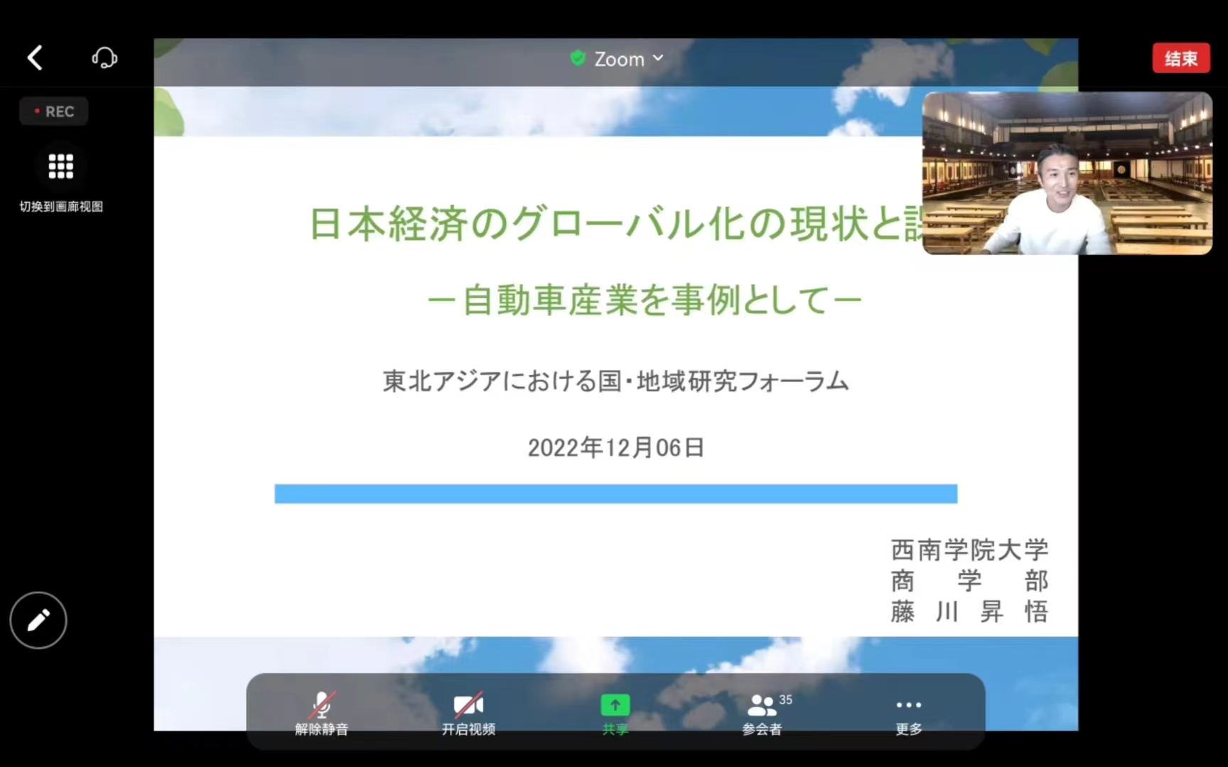 日本研究所、国际文化交流学术联盟东北亚区域研究专门委员会的邀请,日本西南学院大学商学部藤川升悟 (FUJIKAWA SHOGO)教授举行了以“日本经济全球化的现状与问题”为主题的线上讲座。本次讲座由黄色直播