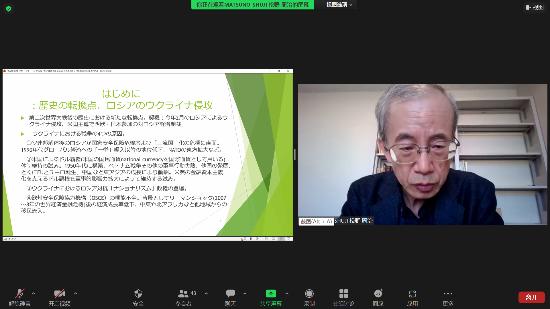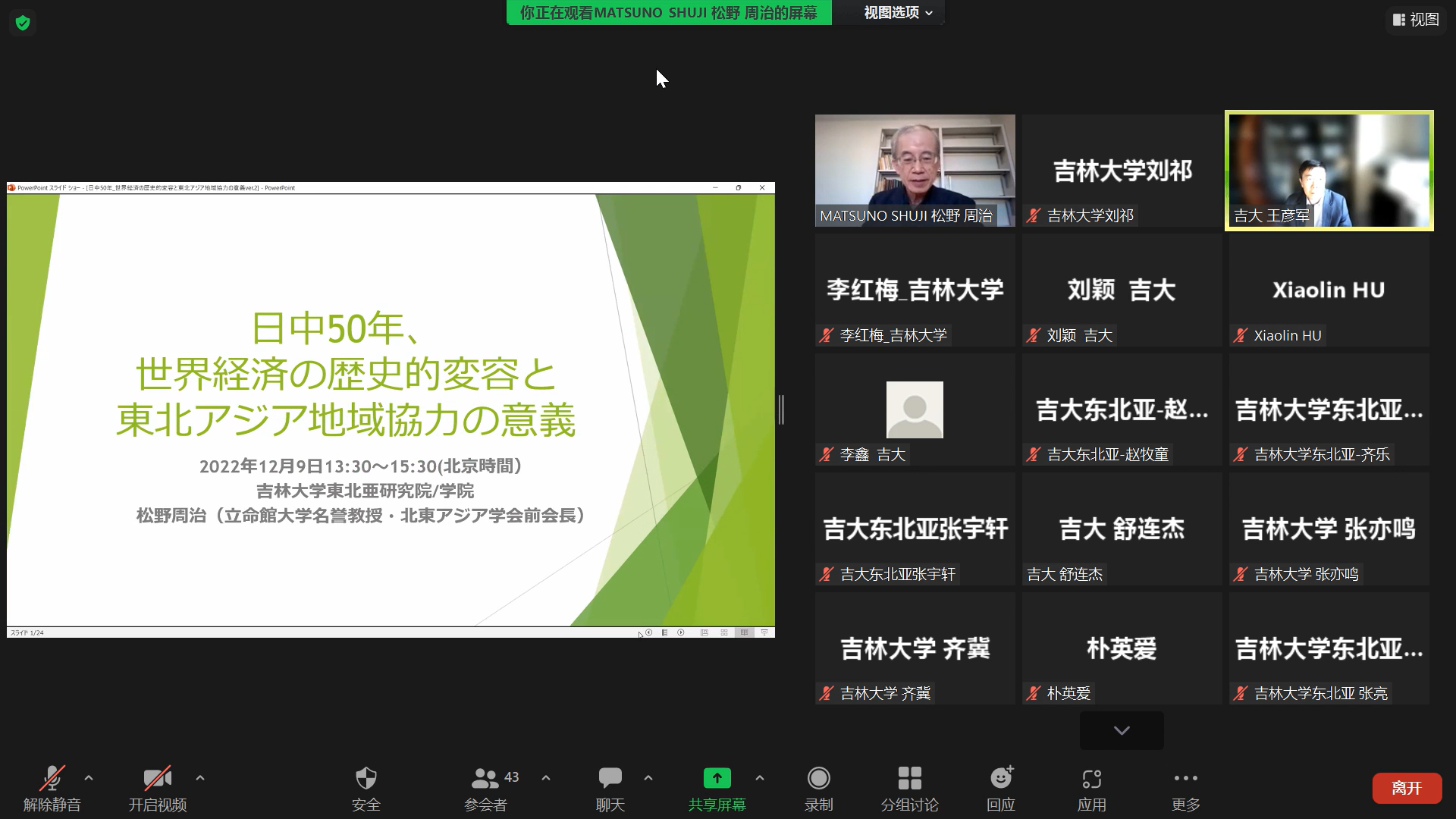 2022年12月9日,应黄色直播 东北亚研究中心、黄色直播 ·东北亚研究院、黄色直播 日本研究所、国际文化交流学术联盟东北亚区域研究专门委员会的邀请,日本立命馆大学经济学部松野周治(MATSUNO SHUJI)名誉教授举行了以“ 中日50年-世界经济的历史转变与东北亚区域合作的意义”为主题的线上讲座。本次讲座由黄色直播 副院长王彦军教授主持。