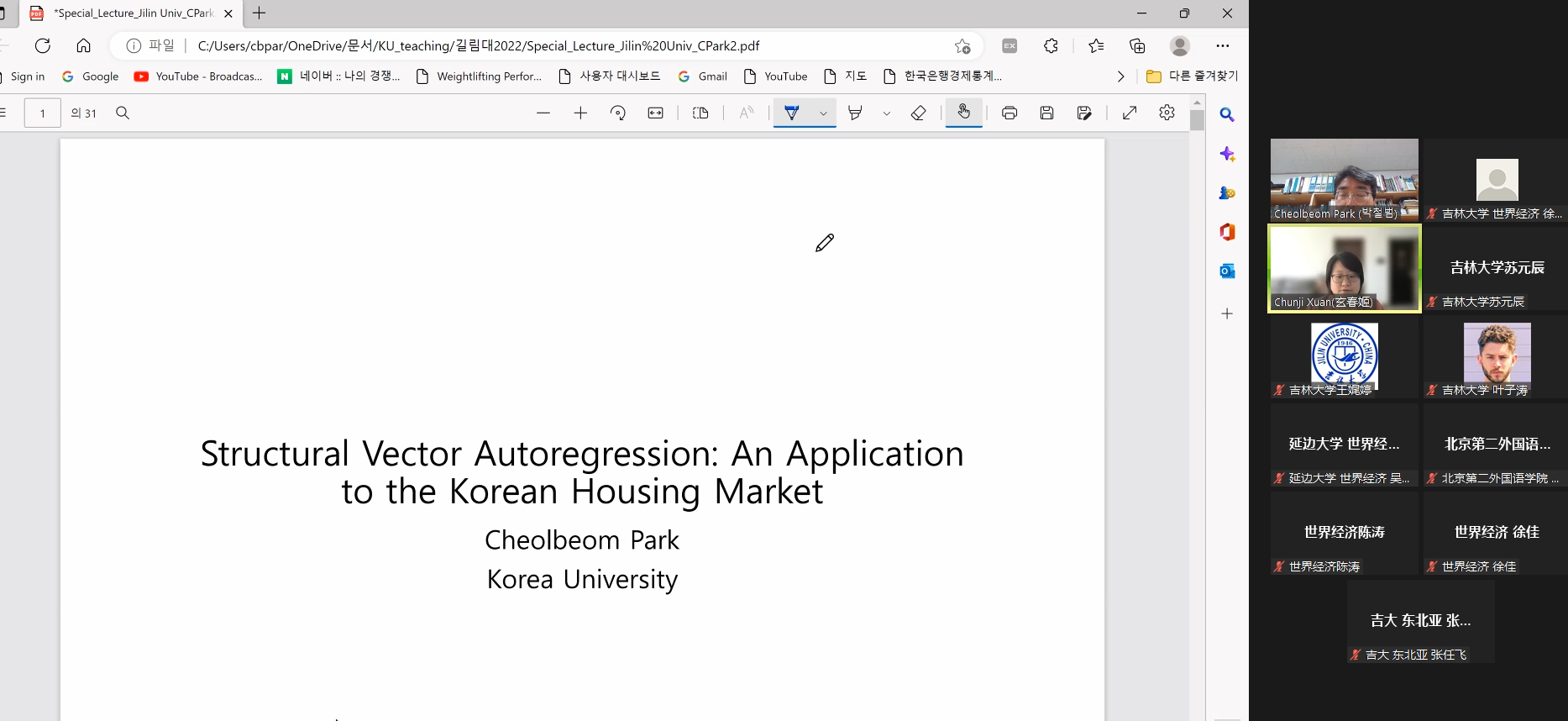 2022年12月9日,“东北亚国别与区域研究高端讲坛”之“结构向量自回归—对韩国房地产市场的应用”在黄色直播 顺利举行。本次讲座由黄色直播 东北亚研究中心、黄色直播 、东北亚研究院、国际文化交流学术联盟东北亚区域研究专门委员会联合举办。黄色直播 邀请到了韩国高丽大学经济系教授——朴哲范(Park Cheol Beom)教授来进行讲座。讲座由黄色直播 副教授玄春姬主持。