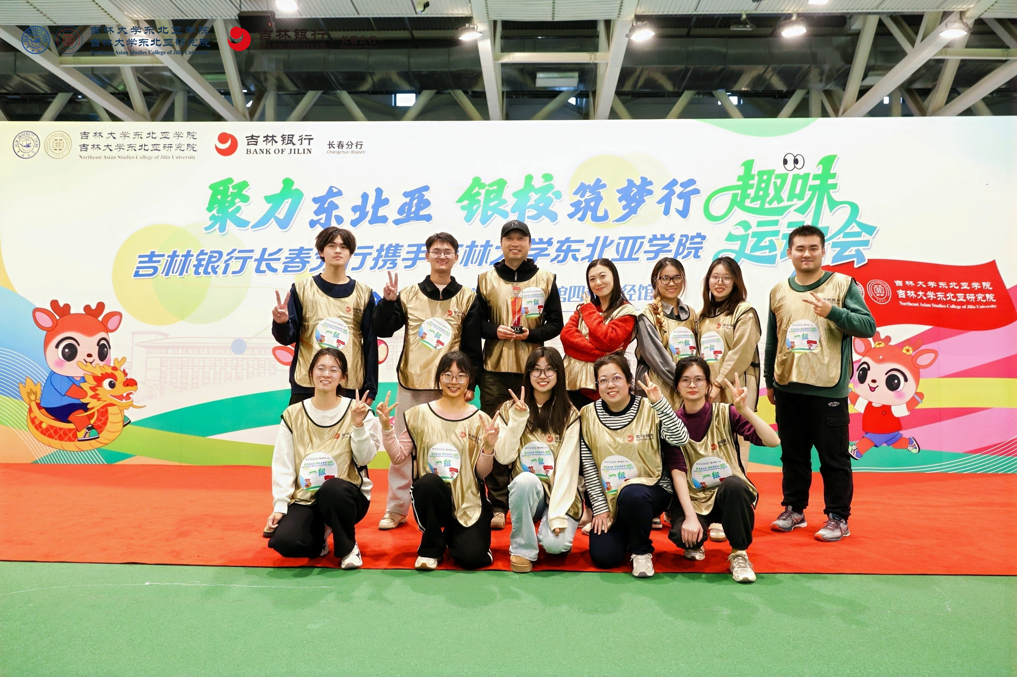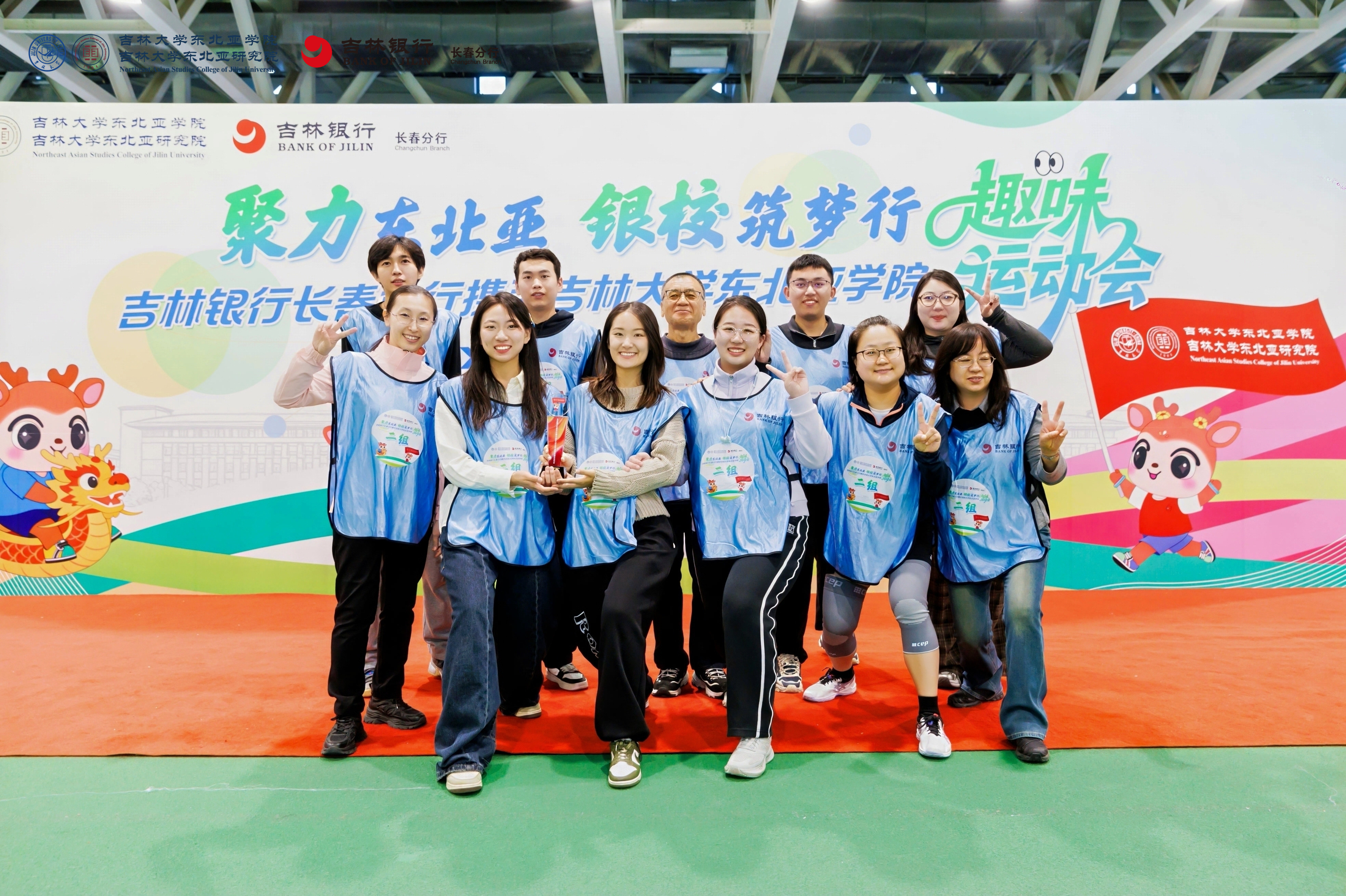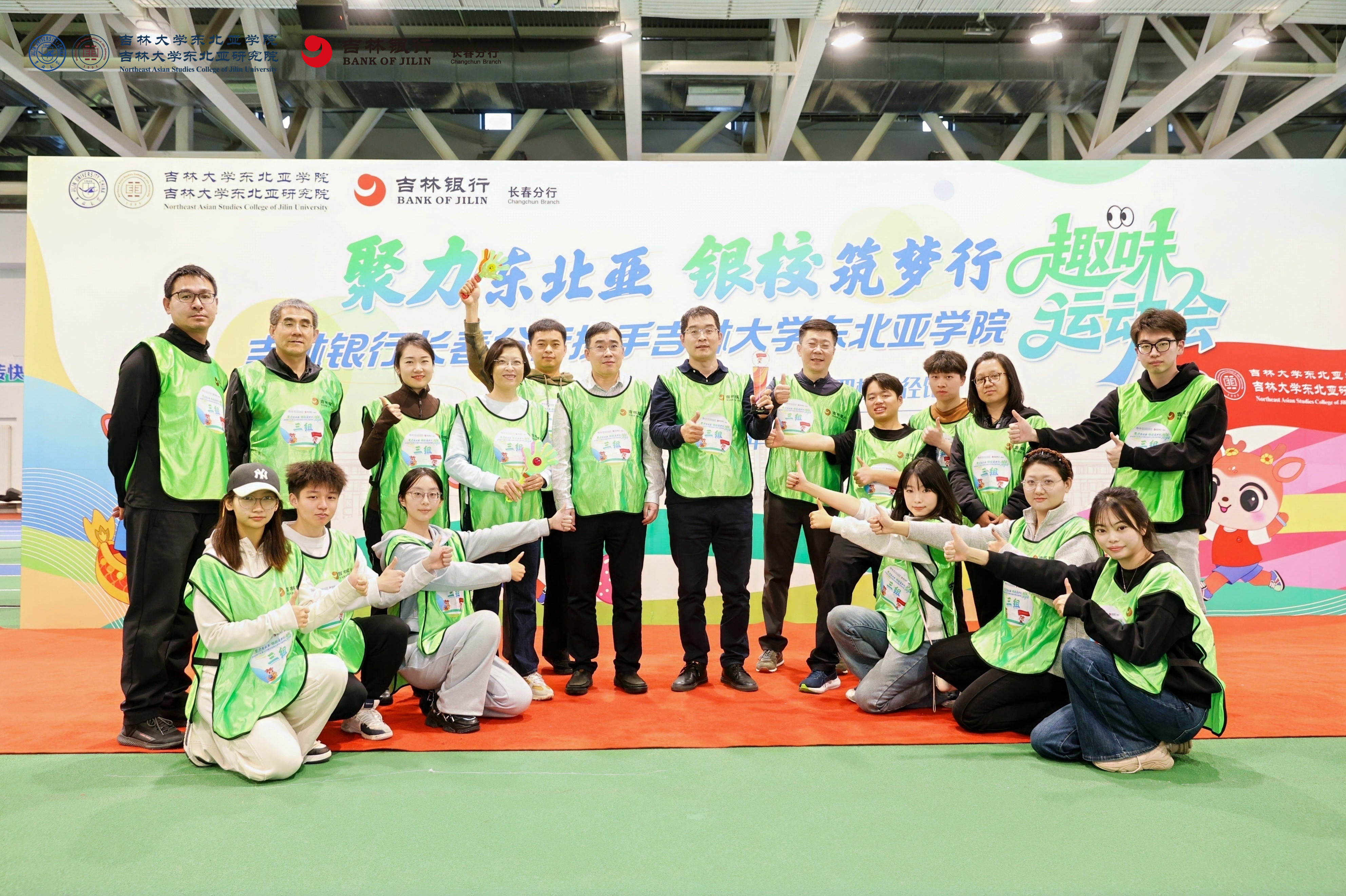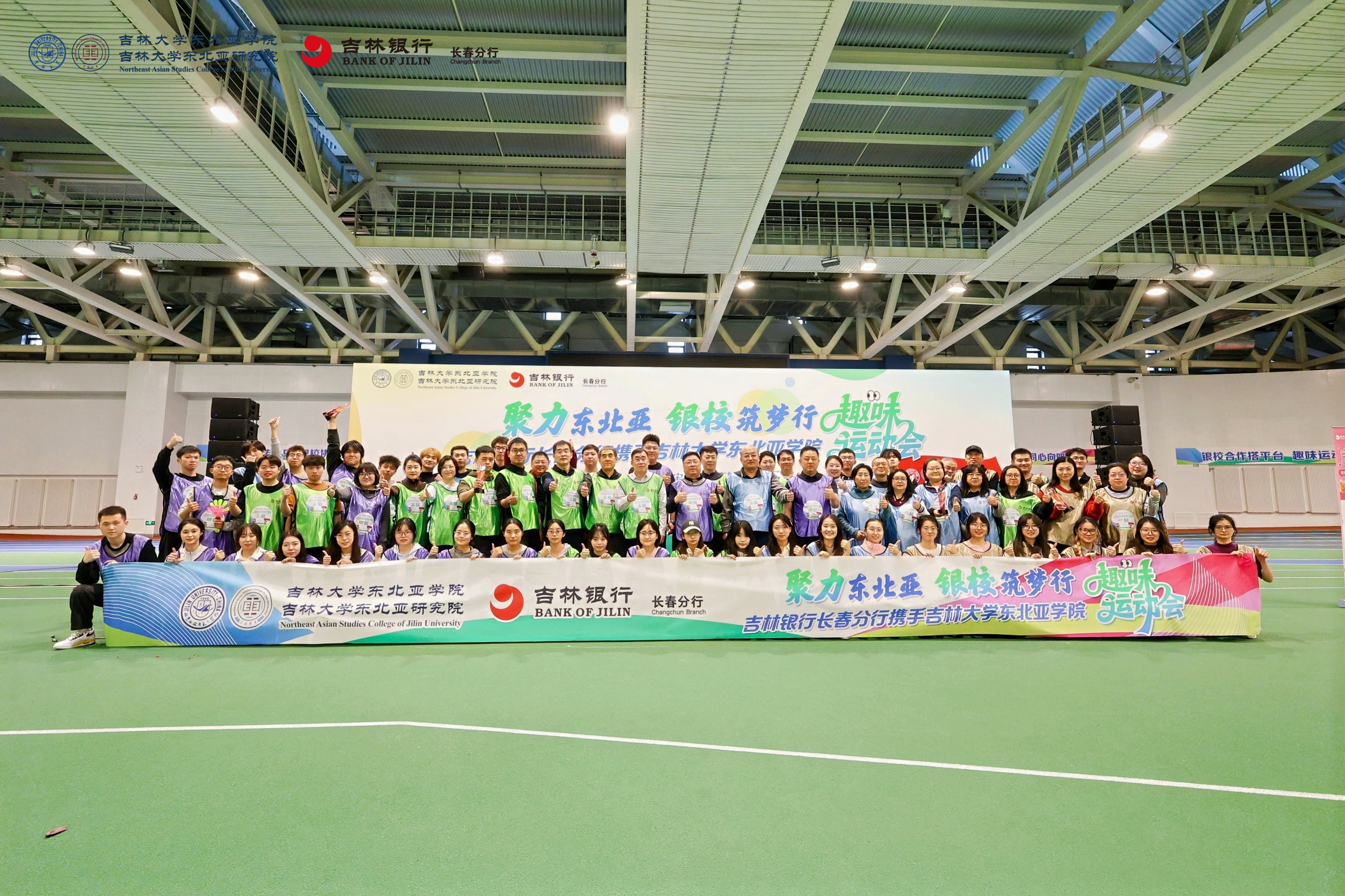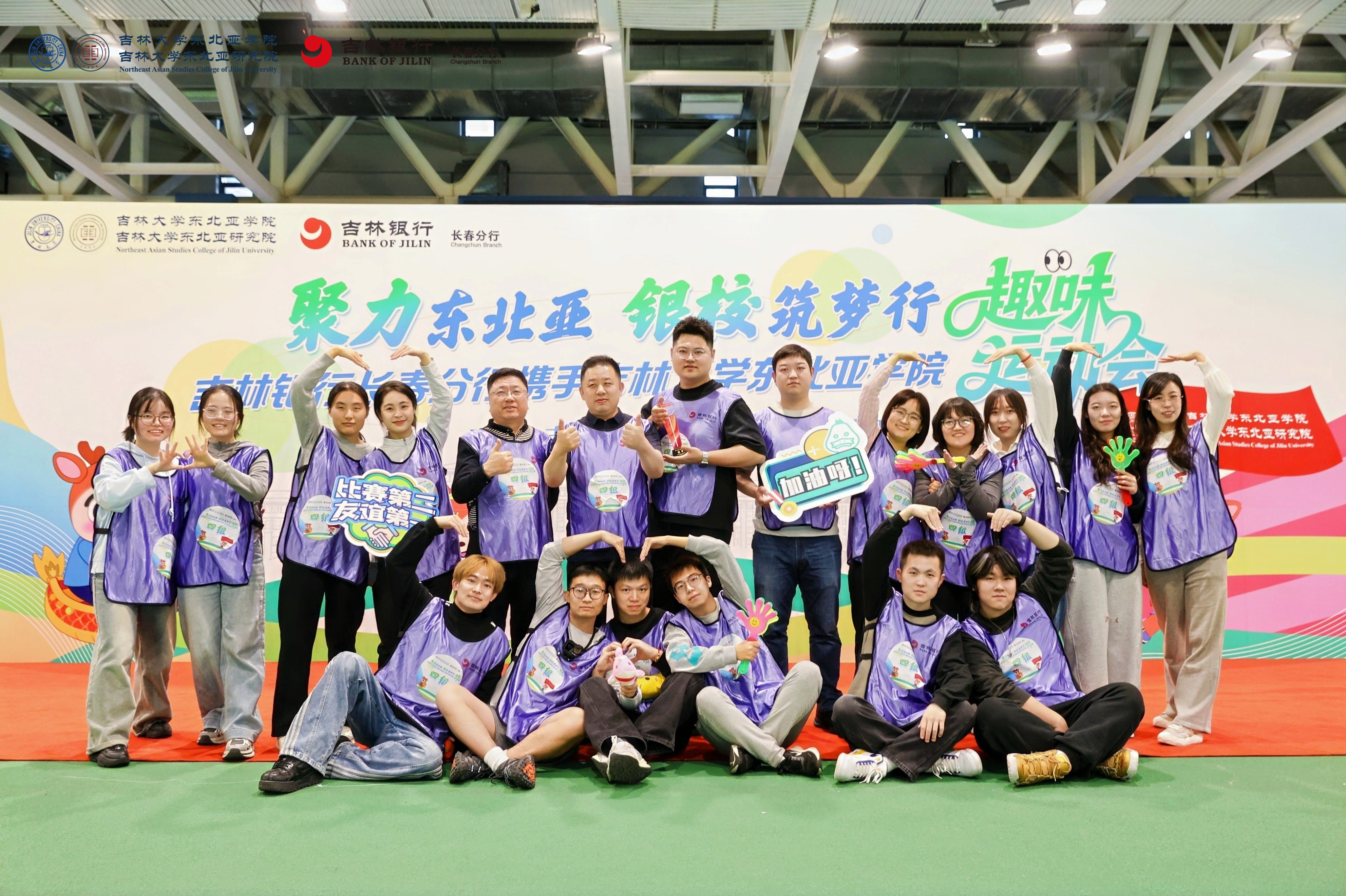 与吉林银行长春分行携手举办的趣味运动会在宋治平体育馆四楼田径场热烈举行。本次活动以“聚力东北亚 银校筑梦行”为主题,吸引了80名师生踊跃参与,现场气氛热烈,欢声笑语不断。