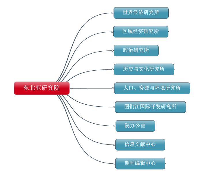 东北亚研究院下设办公室、6个研究所,文献信息中心和期刊编辑中心。6个研究所分别为世界经济研究所、区域经济研究所、国际政治研究所、历史与文化研究所、人口、资源与环境研究所、图们江国际开发研究所。